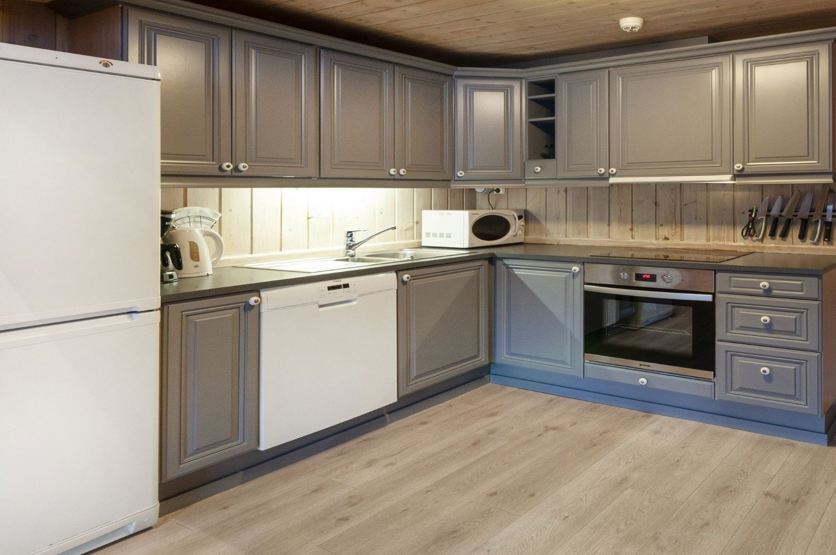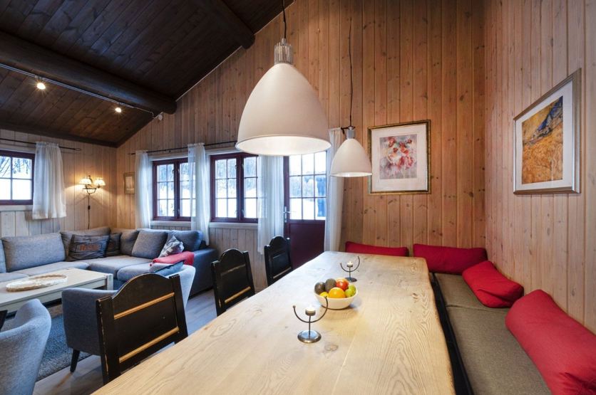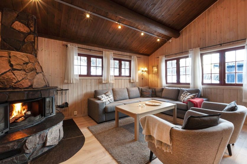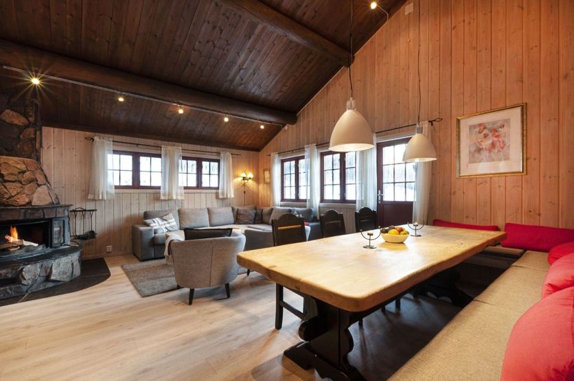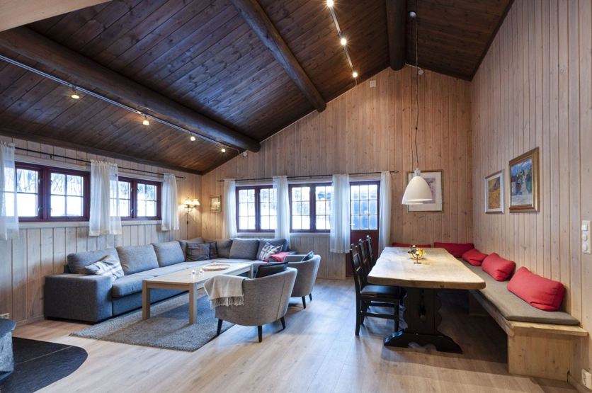 Åben planløsning med køkkenafdeling med komfur m/ovn, køleskab, fryser, mikroovn, opvaskemaskine og kaffemaskine. Opholdsrum/stue med sofagruppe, TV, pejseovn og spiseplads til 10 pers. Terrasse. Skiskab. Hytten er privatejet, interiør kan derfor variere.