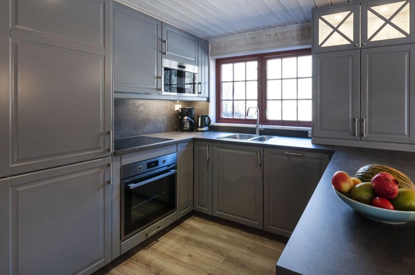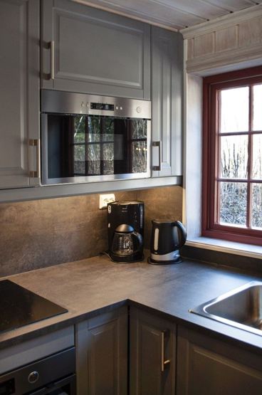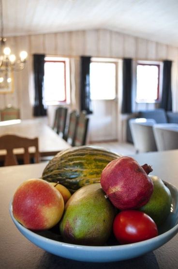 Åben planløsning med køkkenafdeling med komfur m/ovn, køleskab, fryser, mikroovn, opvaskemaskine og kaffemaskine. Opholdsrum/stue med sofagruppe, TV, pejseovn og spiseplads til 12 pers. Terrasse. Skibod.