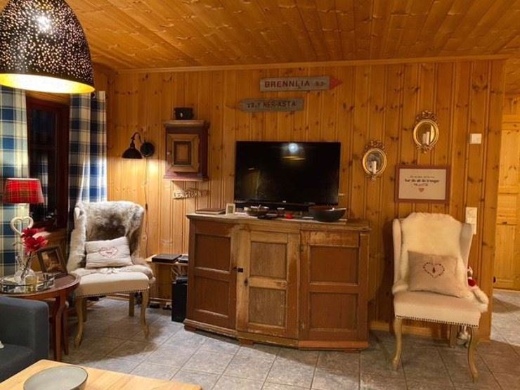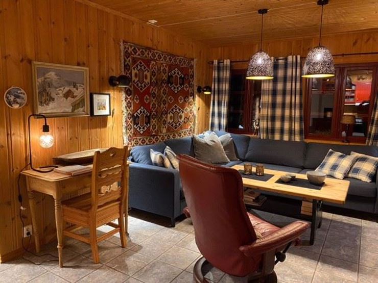 Opholdsstue med TV, sofa, pejseovn. Spisebord til 10 pers. Vaskemaskine. Terrasse, skiopbevaring, Udendørs parkering.