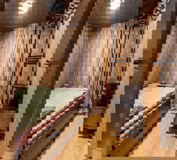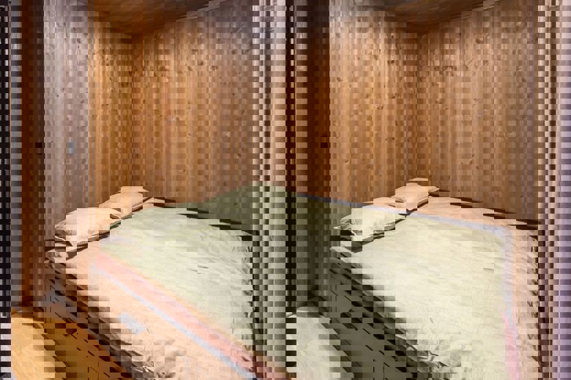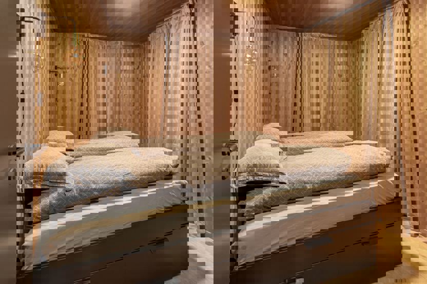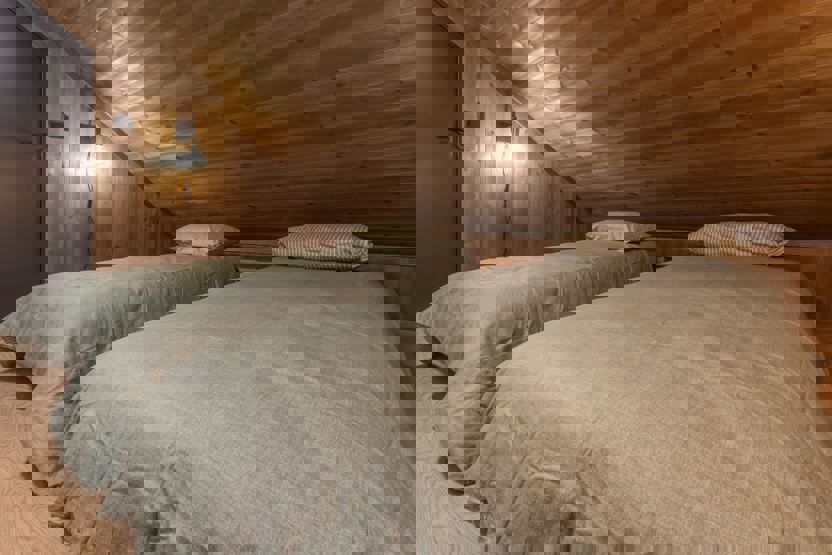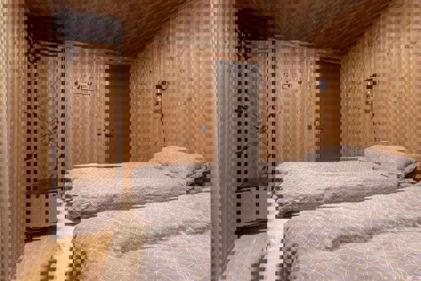 Soverum 1+2: 1 dobbeltseng (160cm x 200cm) Soverum 3+4: 2 enkeltsenge (80cm x 200cm)