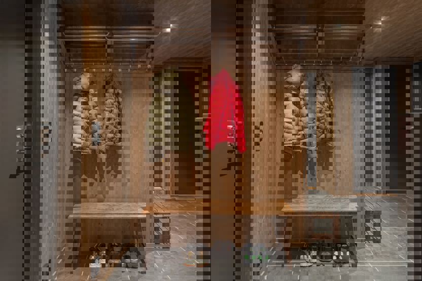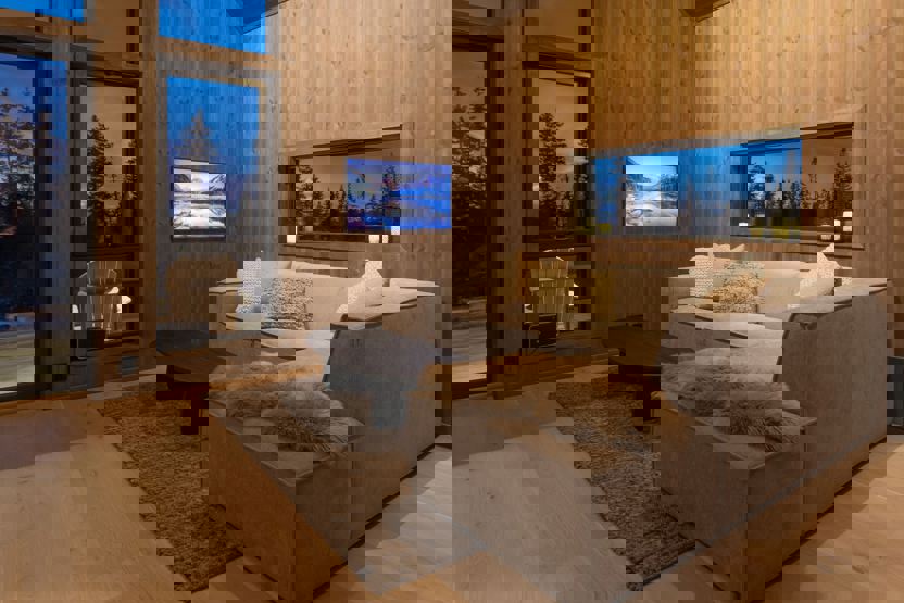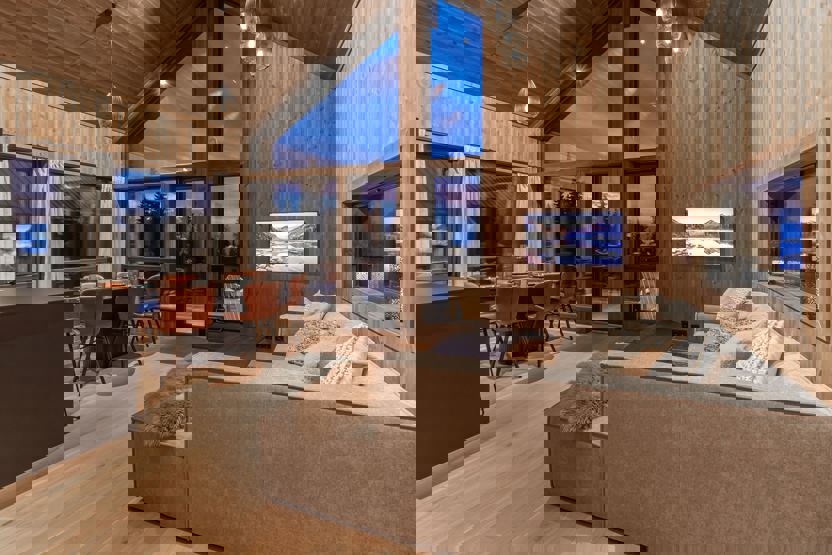 Øvre Skålmyrvegen 113 - 8 personer. Hytte i 2 etager, 4 soveværelser. Åben planløsning med fuldt udstyret køkken med spiseplads til 8 personer. Opholdsstue med sofa, TV og brændeovn. 1 bruser, 2 WC. Vaskemaskine og tørretumbler. Terrasse.