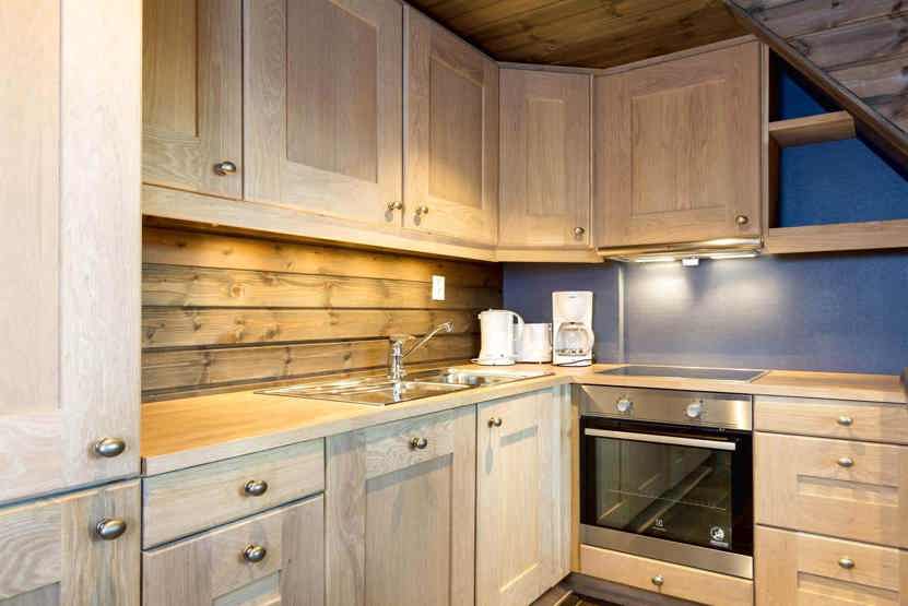 Køkkenet indeholder bl.a. kogeplade med 2 kogeplader, ovn, køleskab m/fryser, opvaskemaskine.