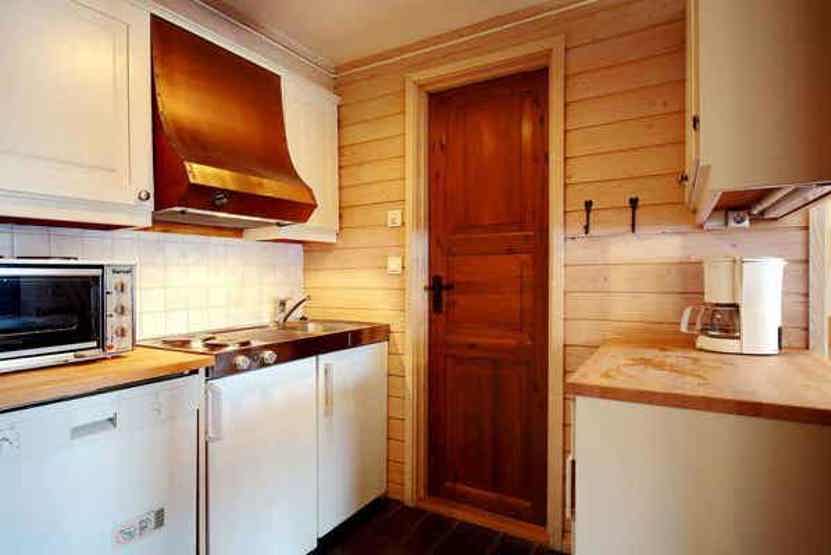 Køkkenet indeholder bl.a: bordovn med 2 kogeplader, lille ovn, køleskab, opvaskemaskine.