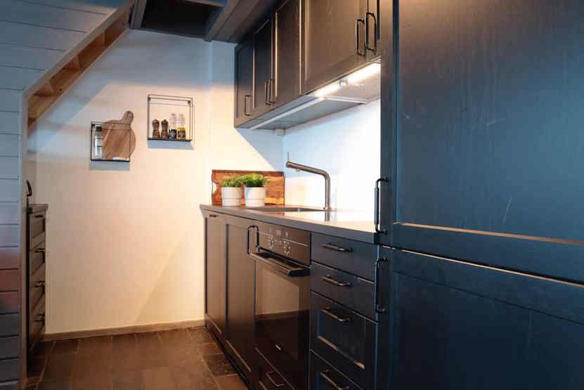 Køkkenet indeholder bl.a. kogeplade med 2 kogeplader, ovn, køleskab m/fryser, opvaskemaskine.