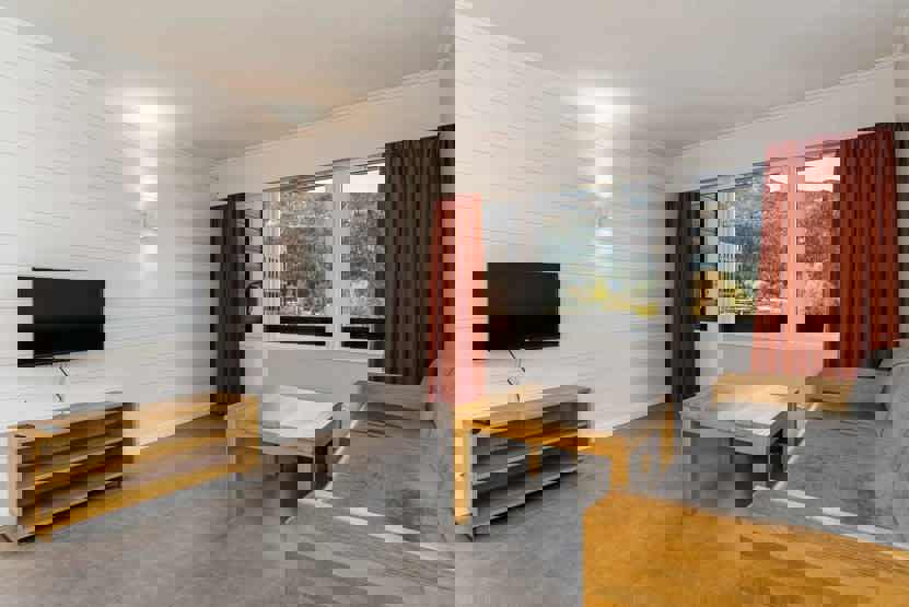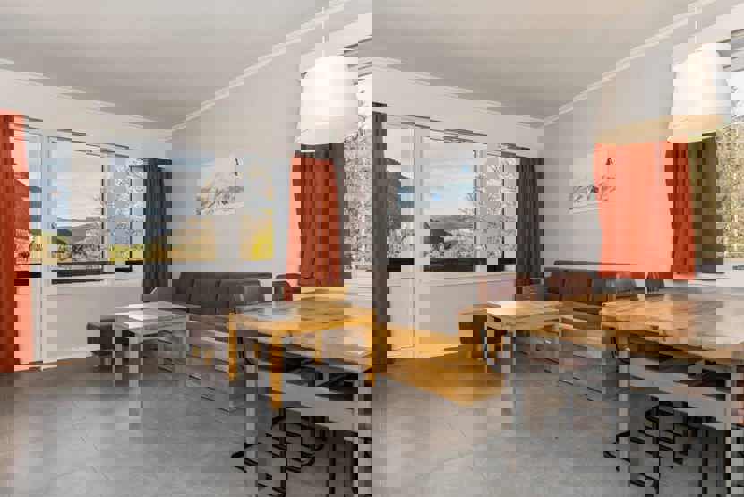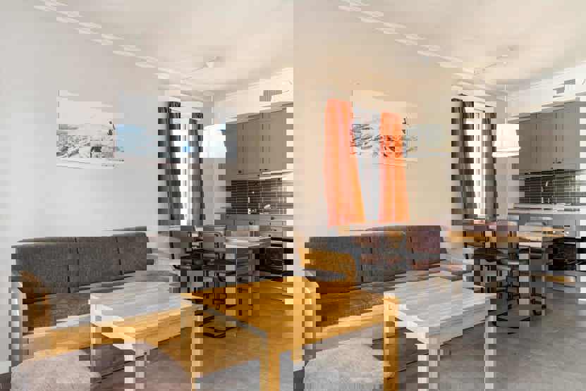 2+2 personers lejlighed, lys og praktisk lejlighed med åben planløsning og højt til loftet. Lejlighed i stueetage, 42 m². 1 soveværelse. Opholdsstue med TV, sovesofa og køkkenafdeling. 1 bruser, 1 WC. Skiopbevaring.