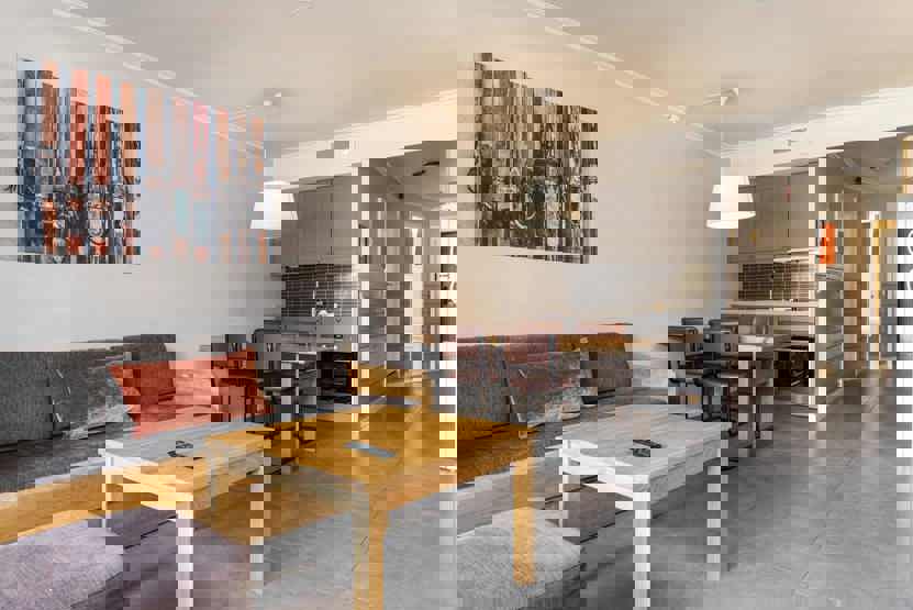 2+2 personers lejlighed, lys og praktisk lejlighed med åben planløsning og højt til loftet. Lejlighed i stueetage, 42 m². 1 soveværelse. Opholdsstue med TV, sovesofa og køkkenafdeling. 1 bruser, 1 WC. Skiopbevaring.
