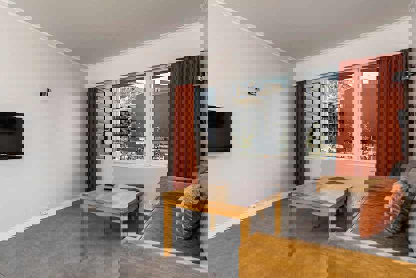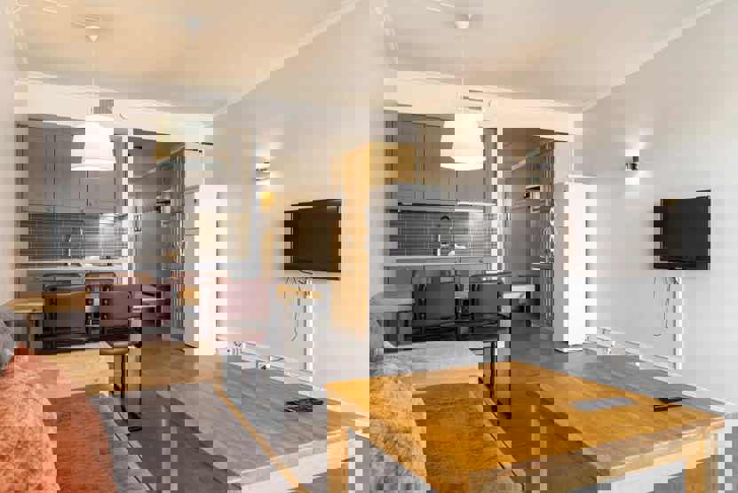 Lejlighed i stueetage, 42 m². 1 soveværelse. Opholdsstue med TV, sovesofa og køkkenafdeling.