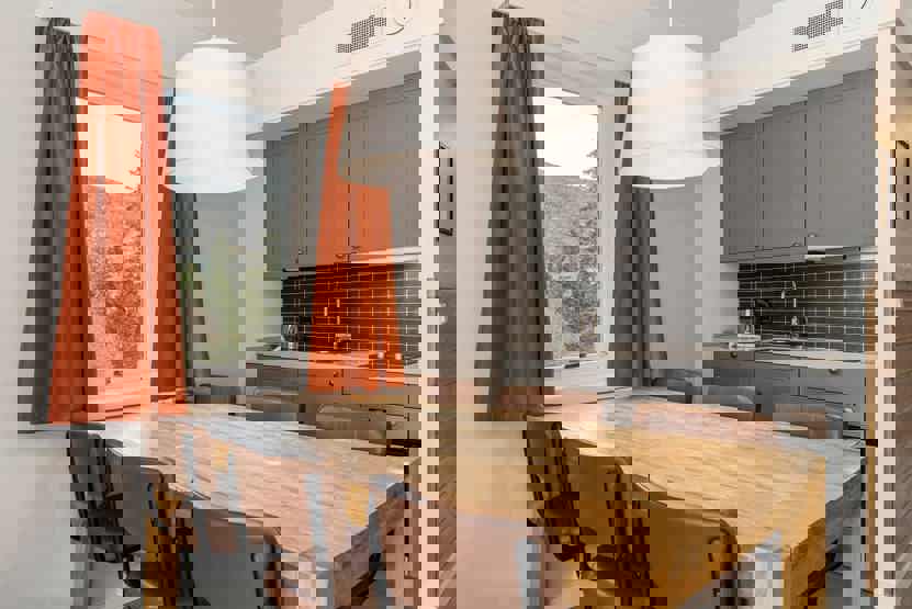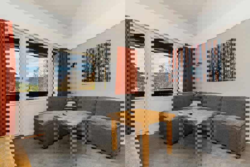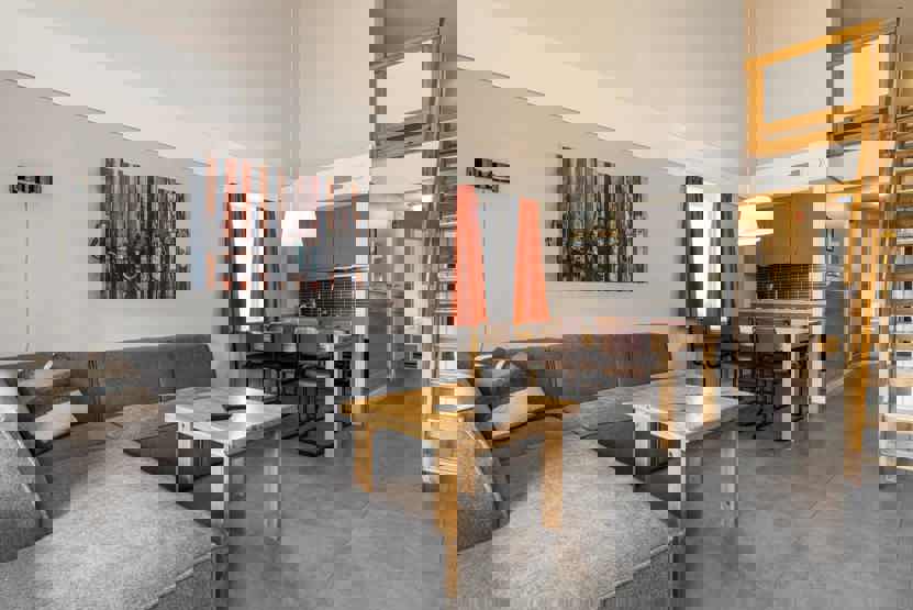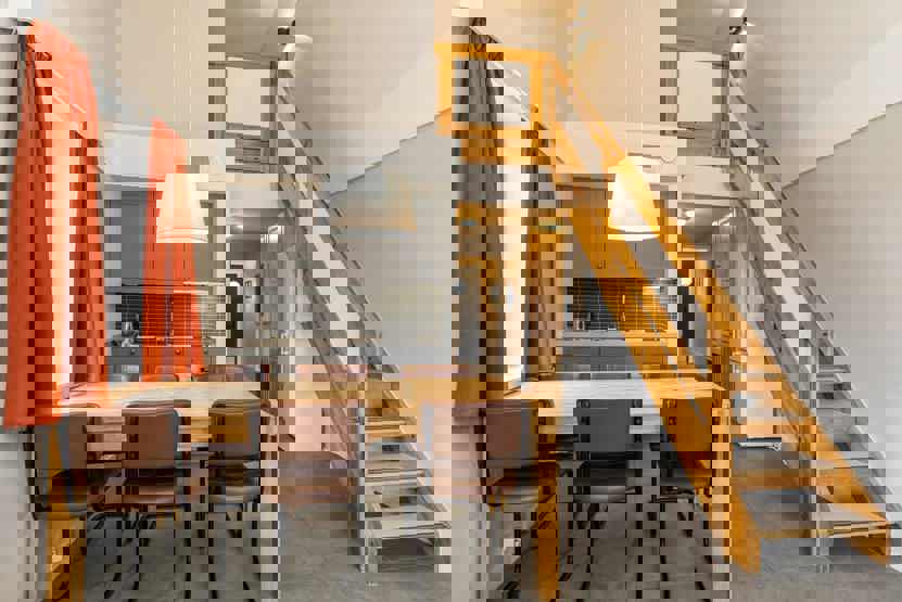 6 personers lejlighed med åben planløsning og højt til loftet. Lejlighed på 1. sal, 60 m².