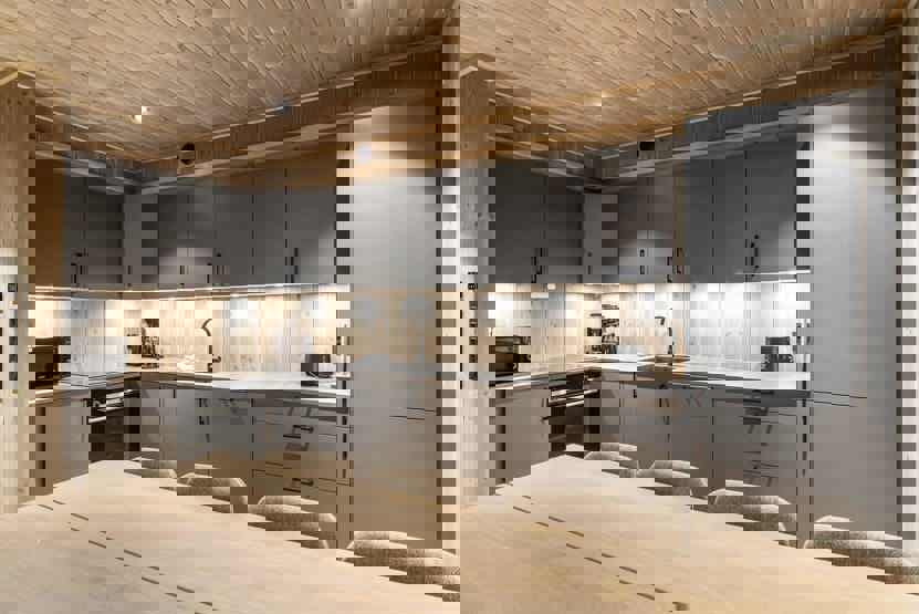 Indeholder bl.a. komfur med ovn, køleskab m/fryser. opvaskemaskine. mikroovn