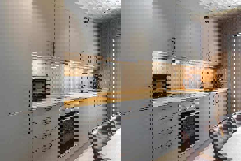 Indeholder bl.a. opvaskemaskine, komfur m/ovn, mikroovn, køleskab m/fryser.