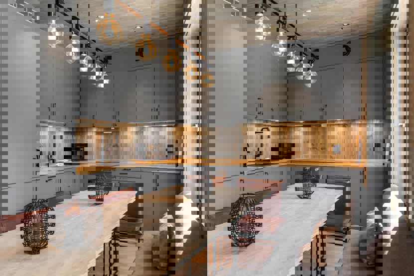 Indeholder bl.a. opvaskemaskine, komfur m/ovn, mikroovn, køleskab m/fryser.