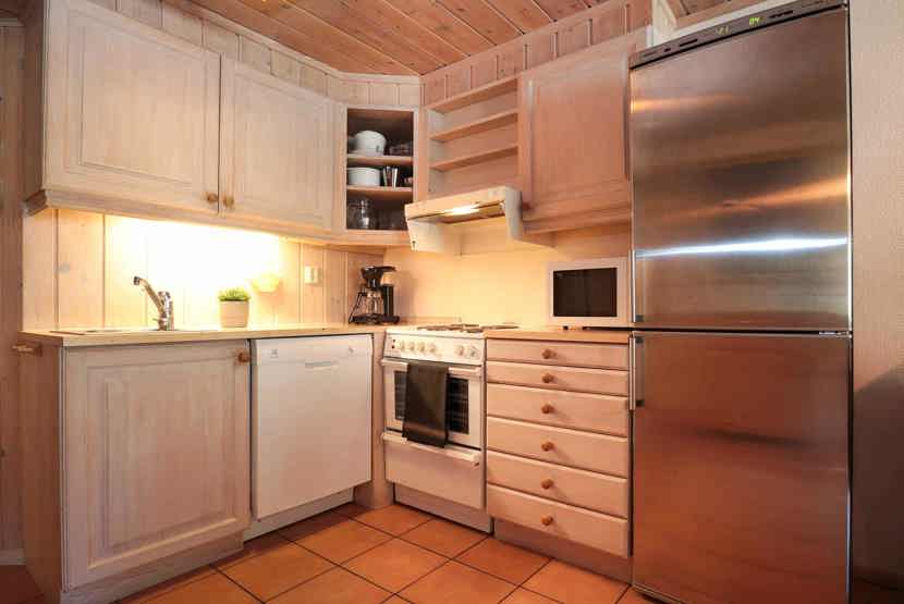 Indeholder bl.a. opvaskemaskine, mikroovn, komfur, køleskab med fryser.