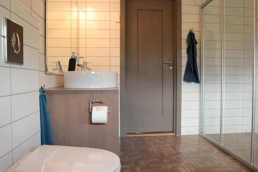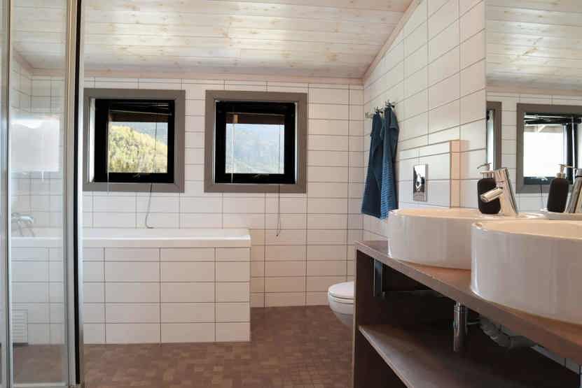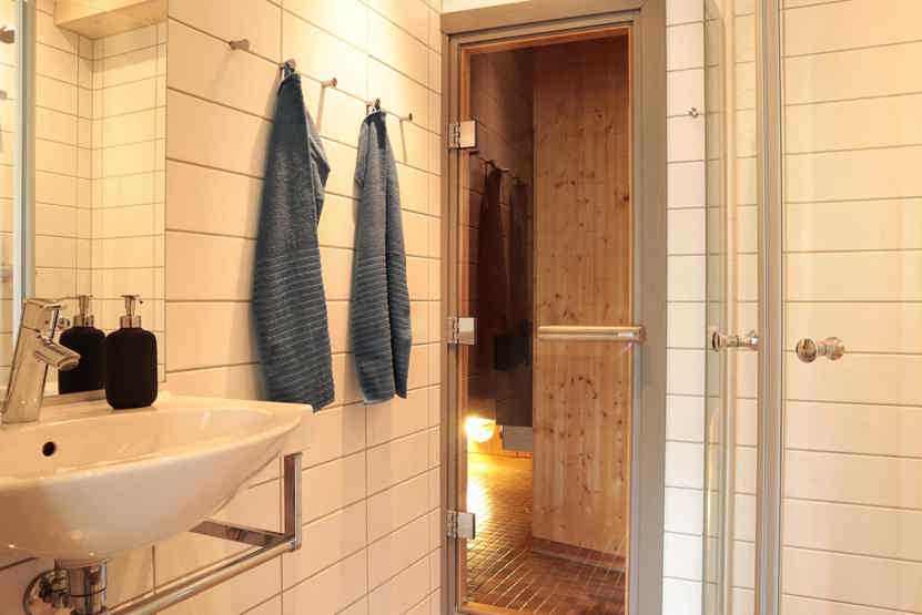 Bad 1: WC, bruser, sauna. Bad 2: WC, 2 vaske, 2 brusere, badekar.