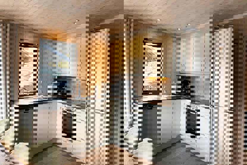 Indeholder bl.a. opvaskemaskine, mikroovn, komfur med ovn, køleskab m/fryser.