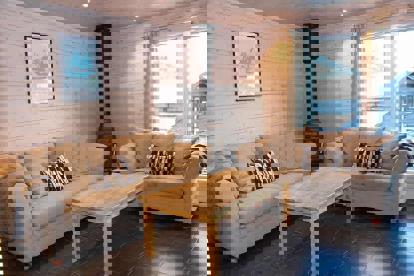 Hytte, 9 sengepladser, 130 m², alrum med køkkenafdeling, TV, brændeovn, 4 soveværelser, 2 brusere, 2 WC, badekar, 1 sauna. Altan. Skiopbevaring. Inkl. højstol og barneseng.