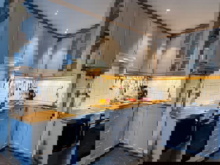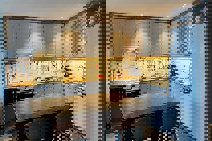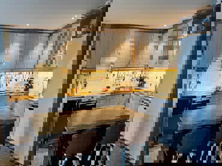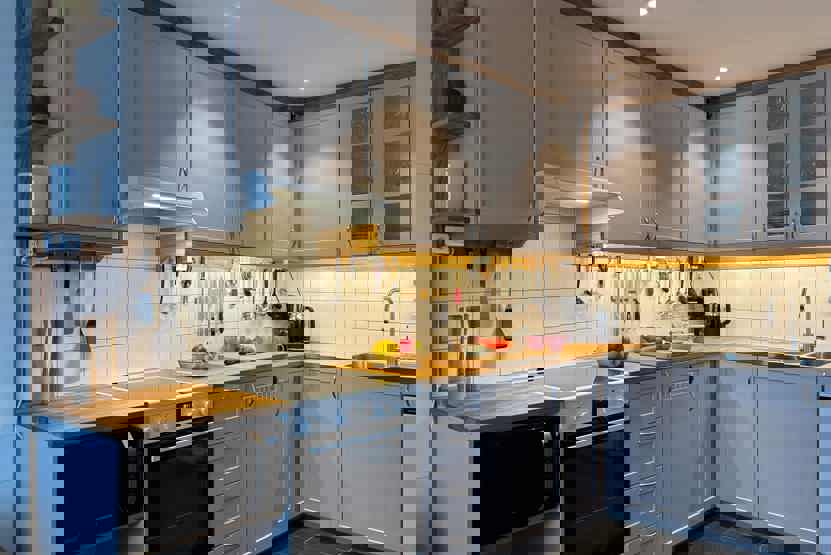 Køkken: Køkkenet indeholder bl.a. komfur med ovn, køleskab m/fryser, opvaskemaskine, mikroovn