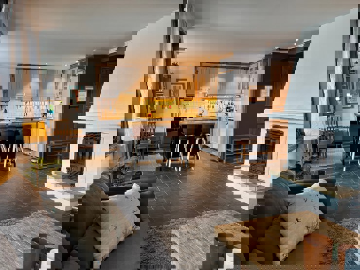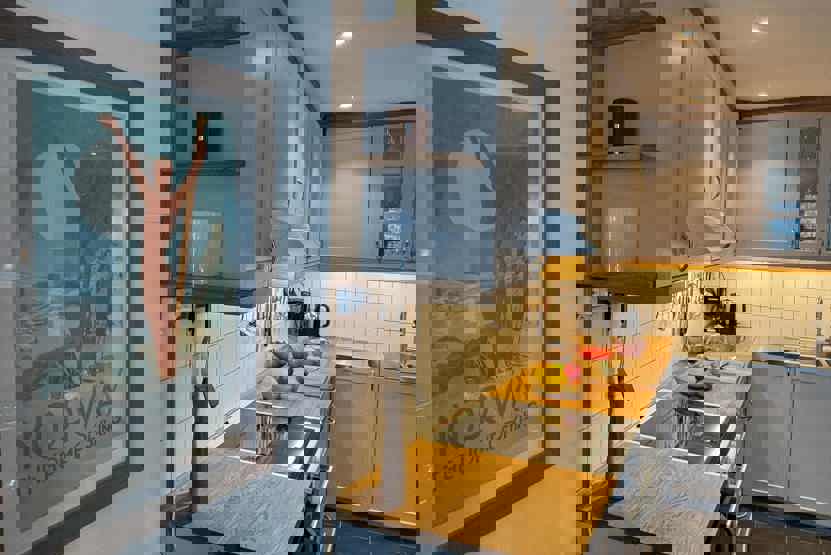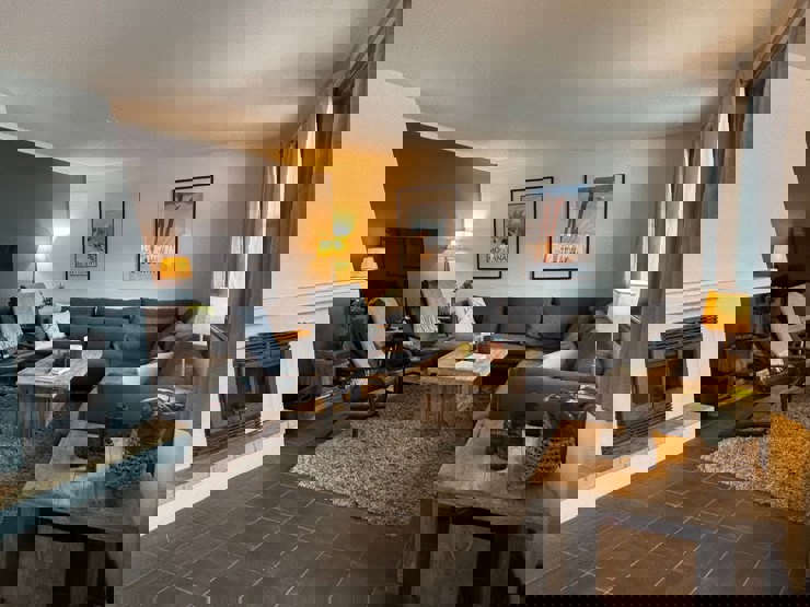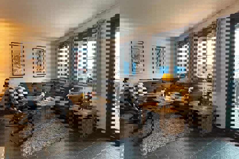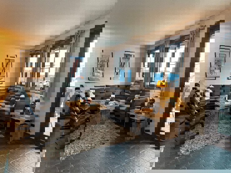 Lejlighed med 8 sengepladser, 84 m2, Alrum med køkkenafdeling, pejs, TV, 3 soveværelser, 1 brusere, 2 WC, 1 sauna. Skiopbevaring.