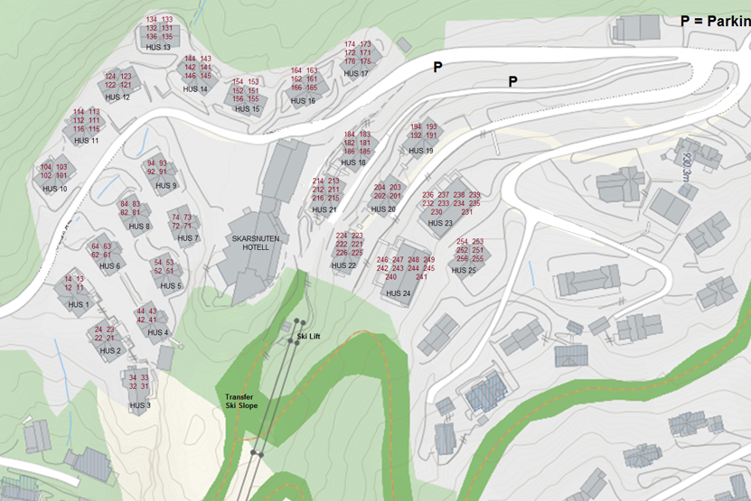 Skarsnuten Fjellandsby 12, ligger 1000 m.o.h i kuperet hytteområde helt til tops. Området har egen stolelift og transportløjpe (blå), der sikre en let skikørsel ned til pisten. Tilbage til Fjellandsbyen er det blot at køre på ski fra topstation til døren. Gratis skibus til og fra Hemsedal Skisenter og centrum kører dagligt. Midt i Fjellandsbyen ligger Skarsnuten Hotel med hyggelig restaurant, bar og skiudleje. Hotellets fælles faciliteter kan benyttes