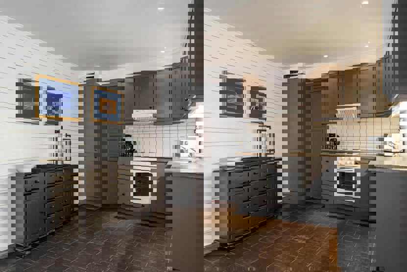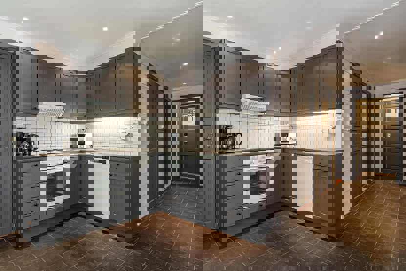 Køkkenet indeholder bl.a. opvaskemaskine, mikro, komfur med ovn, køleskab m/fryser.