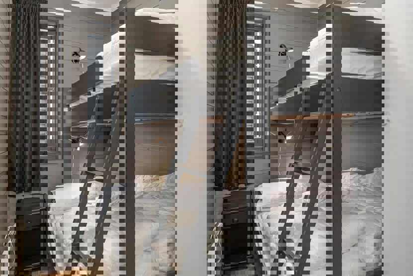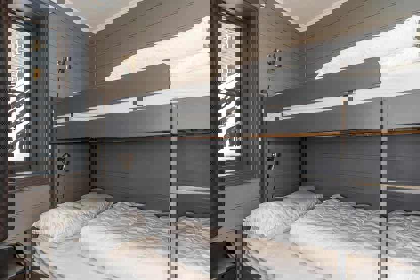 Soveværelse-1= 1 dobbeltseng. Soveværelse-2= 1 køjeseng med 120 cm bred underkøje. Soveværelse-3= 1 køjeseng med 120 cm bred underkøje.