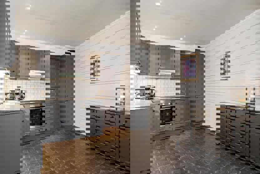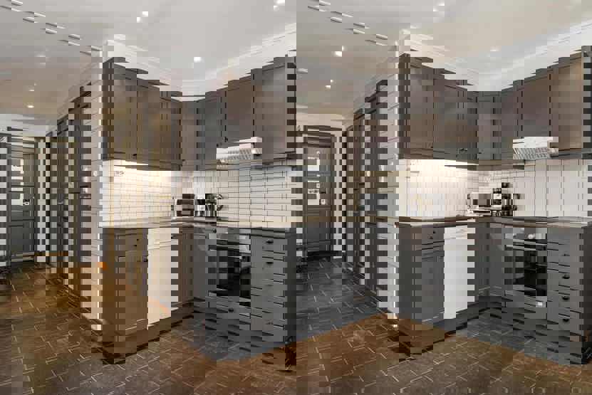 Køkkenet indeholder bl.a. opvaskemaskine, mikro, komfur med ovn, køleskab m/fryser.