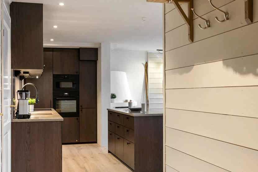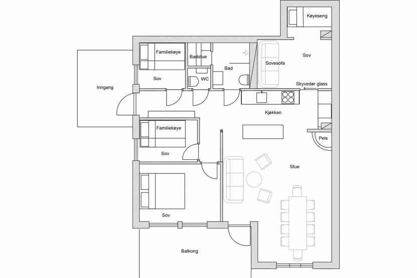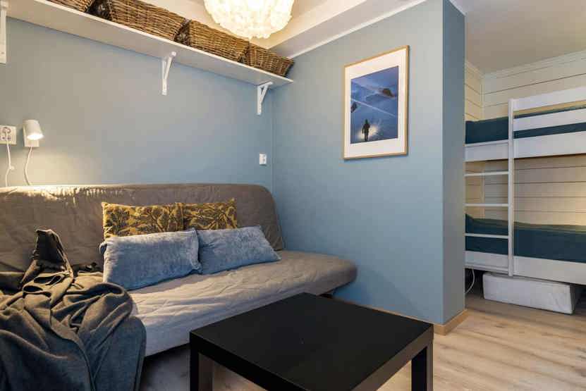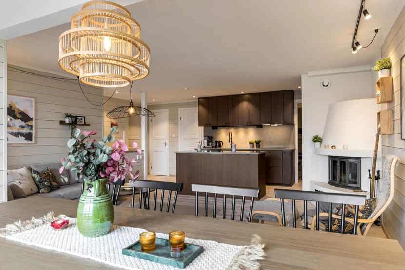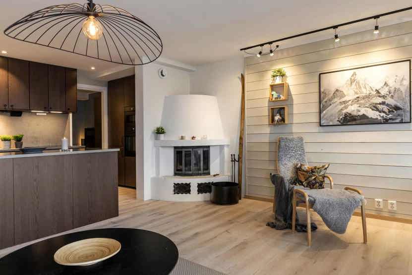 Lejlighed med 6+3 sengepladser, 84 m2, Alrum med køkkenafdeling, pejs, TV, 3 soveværelser, 1 alkove, 1 brusere, 2 WC. 1 sauna, kombineret vaskemaskine/tørretumbler. Skiopbevaring.
