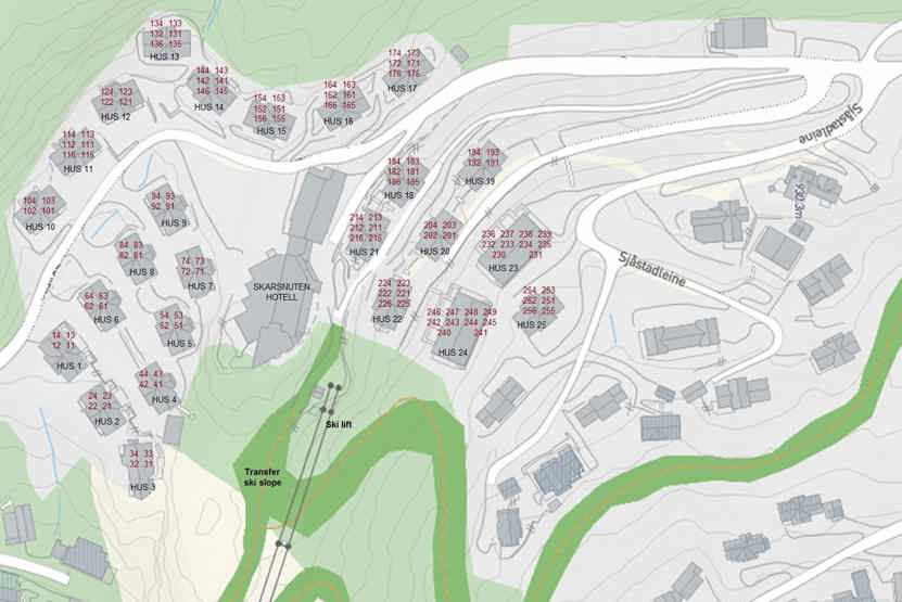 Skarsnuten Fjellandsby 71, ligger 1000 m.o.h i kuperet hytteområde helt til tops. Området har egen stolelift og transportløjpe (blå), der sikre en let skikørsel ned til pisten. Tilbage til Fjellandsbyen er det blot at køre på ski fra topstation til døren. Gratis skibus til og fra Hemsedal Skisenter og centrum kører dagligt. Midt i Fjellandsbyen ligger Skarsnuten Hotel med hyggelig restaurant, bar og skiudleje. Hotellets fælles faciliteter kan benyttes