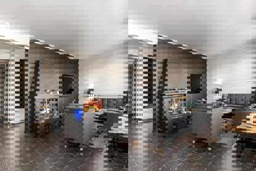 Skarsnuten 183, Lejlighed på 2. sal i 2 etager. 9+1 sengepladser, 119 m2, Opholdsstue med køkkenafdeling, pejs, TV, 4 soveværelser, 2 brusere, 2 WC, sauna, Skarsnuten Fjellandsby ligger i et kuperet område. Adgang til lejligheden kan variere alt efter terrænet.