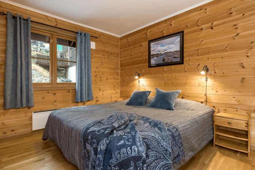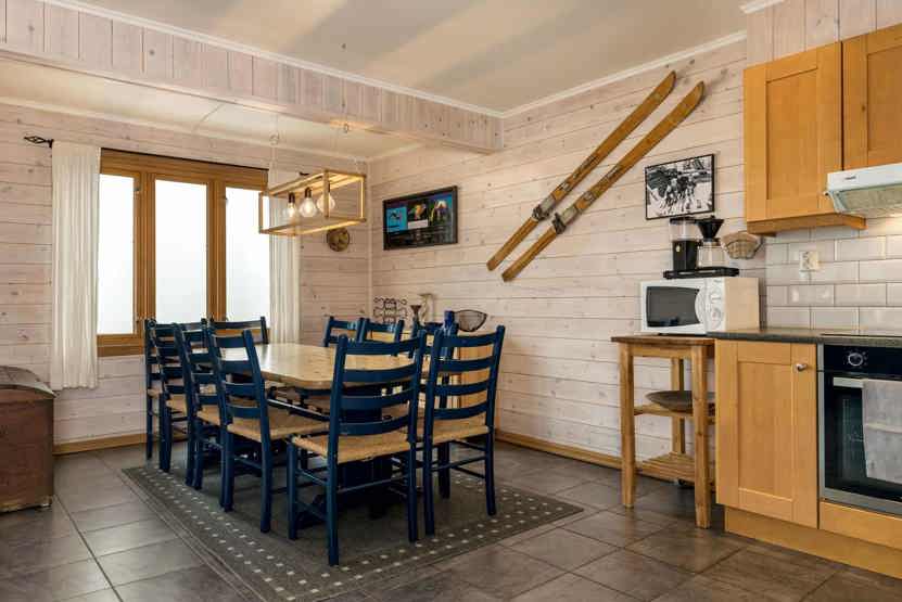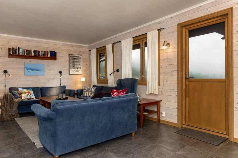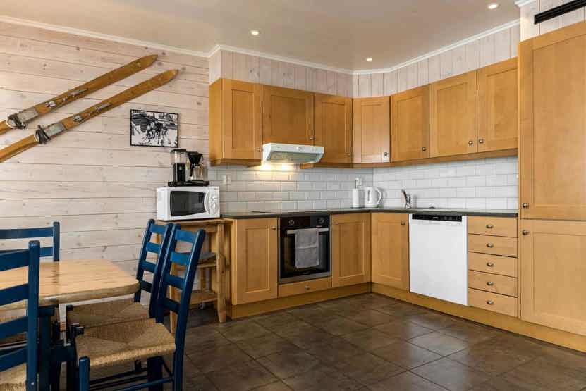 Skarsnuten 223, Lejlighed på 2. sal i 2 etager. 9+1 sengepladser, 119 m2, Opholdsstue med køkkenafdeling, pejs, TV, 4 soveværelser, 2 brusere, 2 WC, sauna, Skarsnuten Fjellandsby ligger i et kuperet område. Adgang til lejligheden kan variere alt efter terrænet.