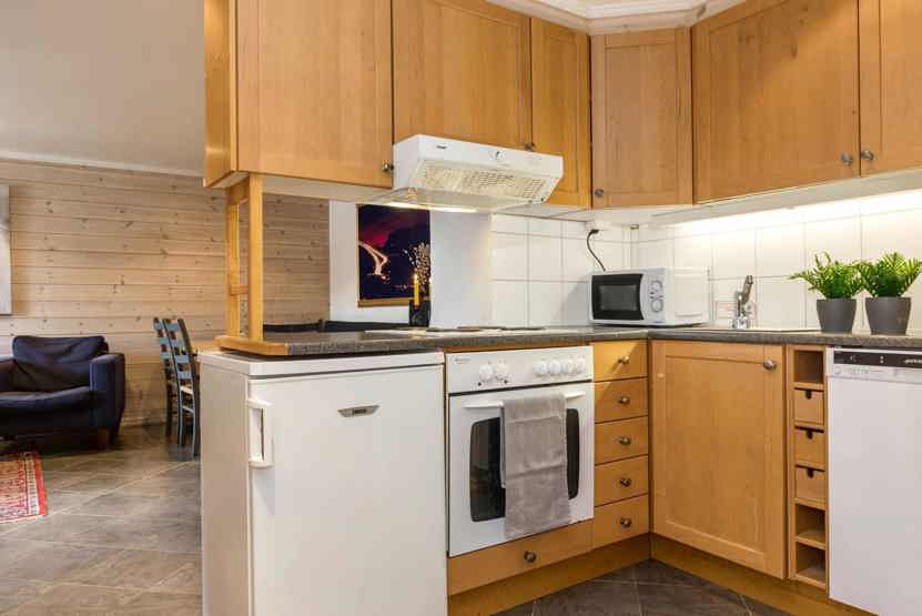 Åben pejs, Kabel-TV. Skiopbevaring, Fryser findes i skiopbevaring, Reduceret udsigt da lejligheden ligger på 1. etage. Skarsnuten Fjellandsby ligger i et kuperet område. Adgang til lejligheden kan variere alt efter terrænet. Ved glat føre, skal snekæder/pigdæk bruges for at undgå stop og kødannelser.