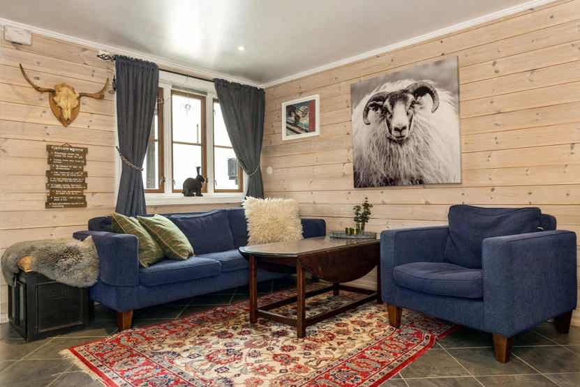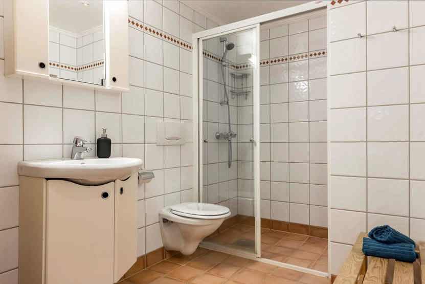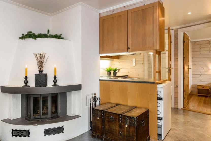Lejlighed med 4+1 sengepladser, 46 m2, Alrum med køkkenafdeling, pejs, TV, 2 soveværelser, 1 bruser, 1 WC,. Fryser i skibod.