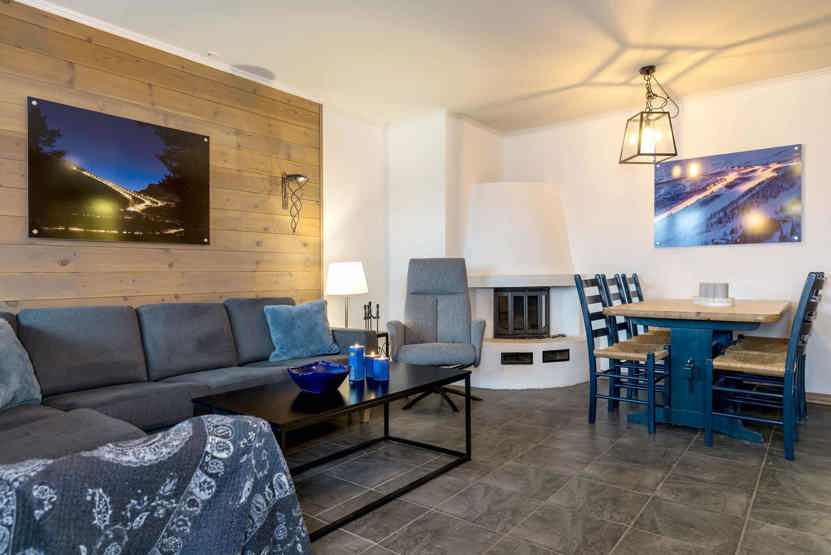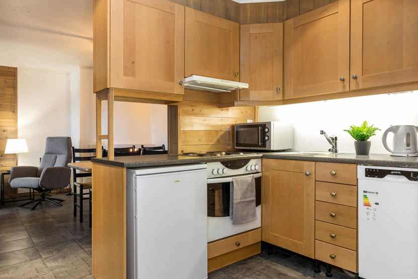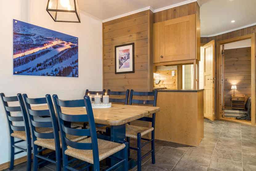 Åben pejs, Kabel-TV. Skiopbevaring, Fryser findes i skiopbevaring, Reduceret udsigt da lejligheden ligger på 1. etage. Skarsnuten Fjellandsby ligger i et kuperet område. Adgang til lejligheden kan variere alt efter terrænet. Ved glat føre, skal snekæder/pigdæk bruges for at undgå stop og kødannelser.