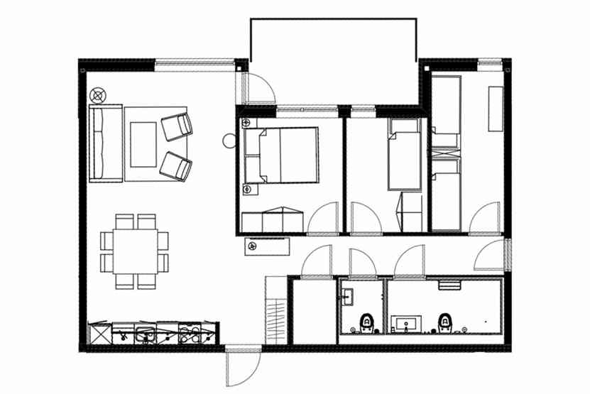 Soveværelse-1= 1 dobbeltseng. Soveværelse-2= 2 køjesenge. Soveværelse-3= 1 køjeseng.