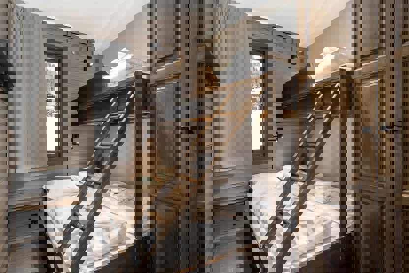Soveværelse-1= 1 dobbeltseng. Soveværelse-2= 1 køjeseng med 150 cm bred underkøje. Soveværelse-3= 1 køjeseng med 150 cm bred underkøje.