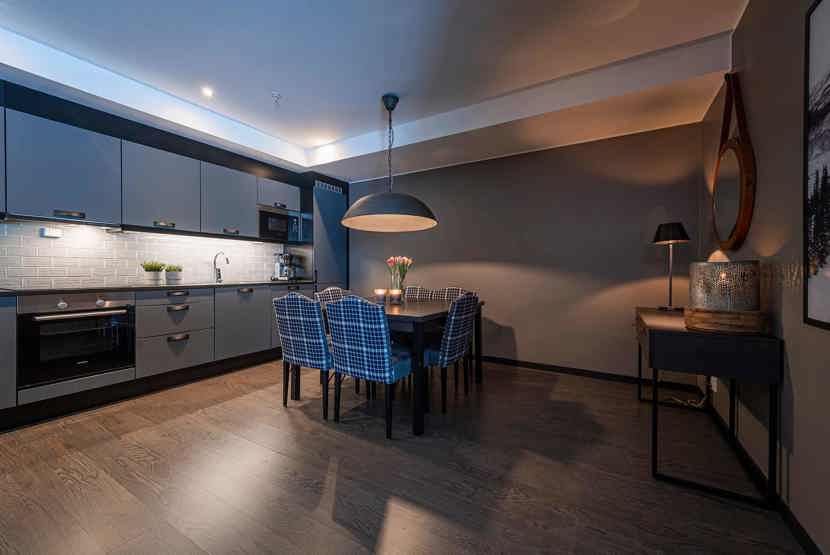 6 personers lejlighed, moderne og med stilfuld indretning. Lejlighed på 1 sal, 65 m². 2 soveværelser. Opholdsstue med TV og fuldt udstyret køkkenafdeling. 1 bruser, 1 WC. Varmeskab, Skiskab findes tæt på receptionen. Adgang til elbilopladere med type 2 stik mod betaling.
