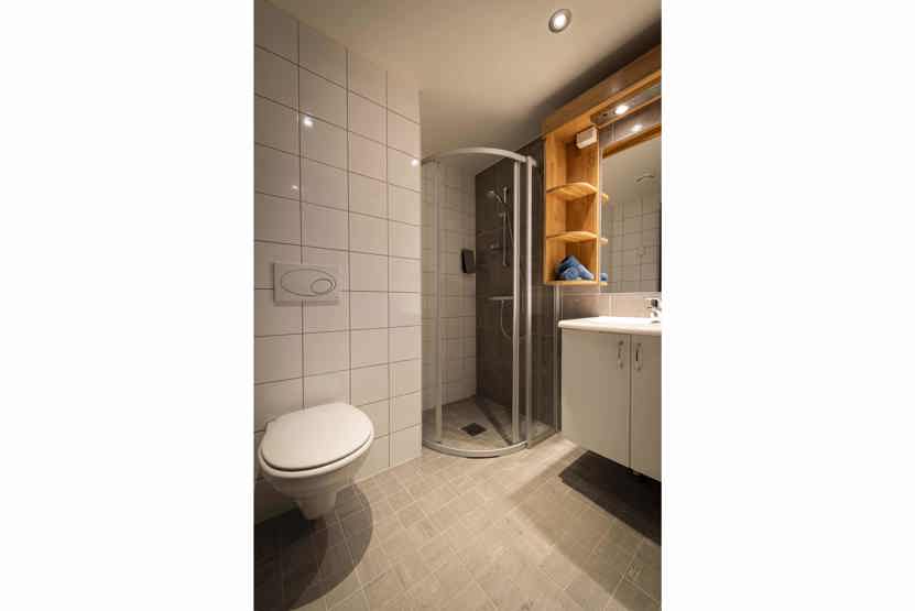 1 bruser, 1 WC. Varmeskab. Skiskab findes ved receptionen.