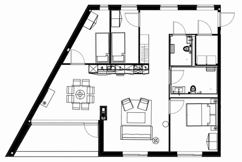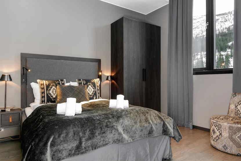 6 personers lejlighed, moderne og med stilfuld indretning. Lejlighed på 4 sal, 100 m². 3 soveværelser. Opholdsstue med TV, gaspejs, fuldt udstyret køkkenafdeling. 2 brusere, 2 WC. Varmeskab, Skiskab findes med skotørrer i huset. Adgang til elbilopladere med type 2 stik mod betaling.