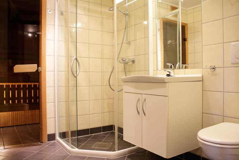Badeværelser: Bad 1: Bruser, WC, sauna.