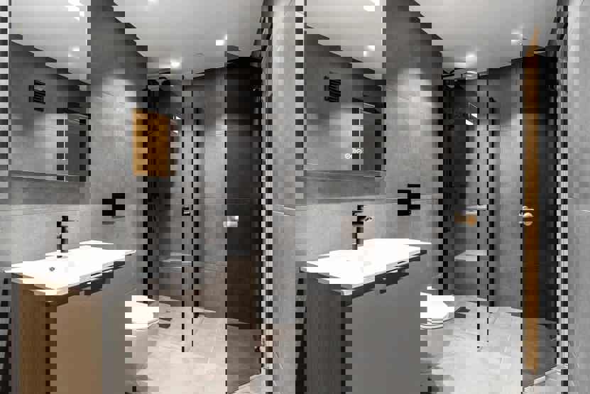 Badeværelser: Bad 1: Bruser, WC, sauna.