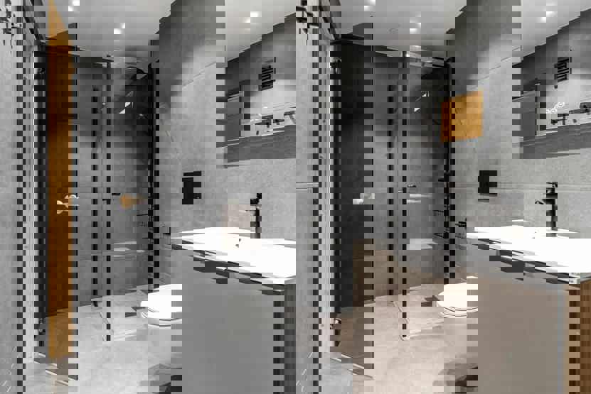 Badeværelser: Bad 1: Bruser, WC, sauna.