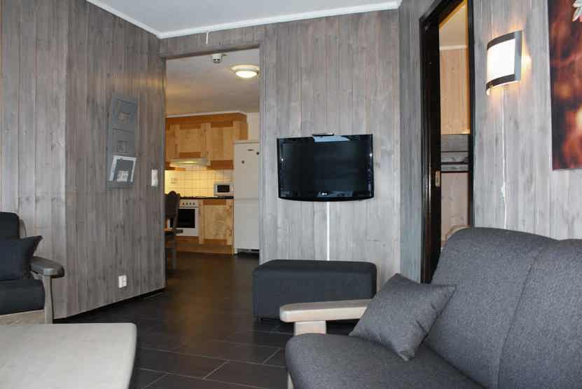 9 personers lejlighed, 78 m². 3 soveværelser. Opholdsstue med gaspejs, TV og fuldt udstyret køkkenafdeling. 2 brusere, 2 WC, 1 sauna. Skiopbevaring.