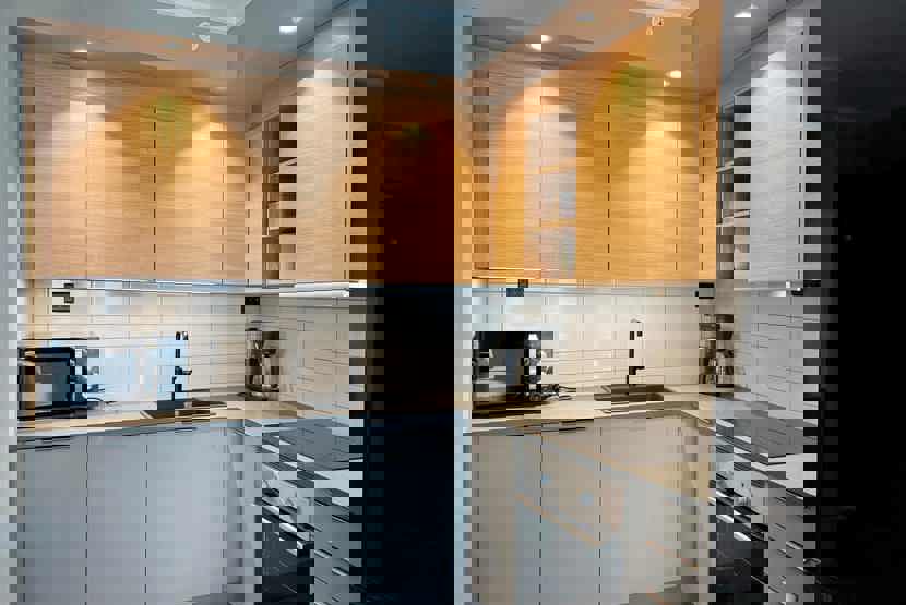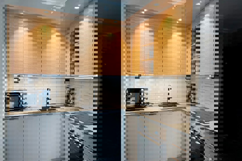 Køkkenet indeholder bl.a: komfur, køleskab m/fryser, opvaskemaskine, mikro.