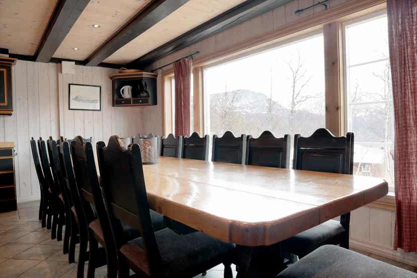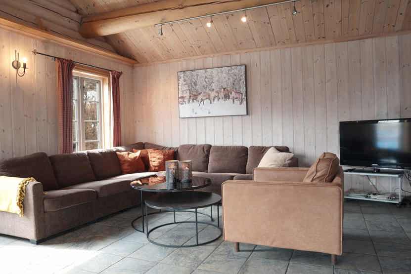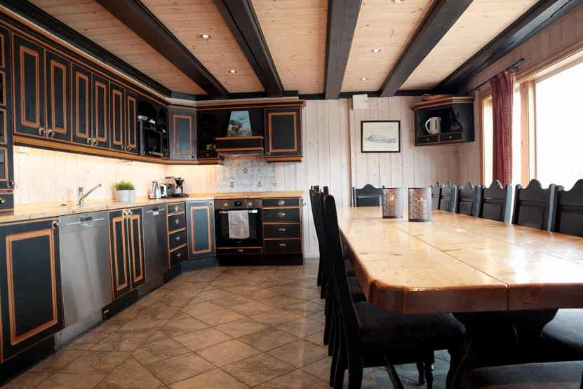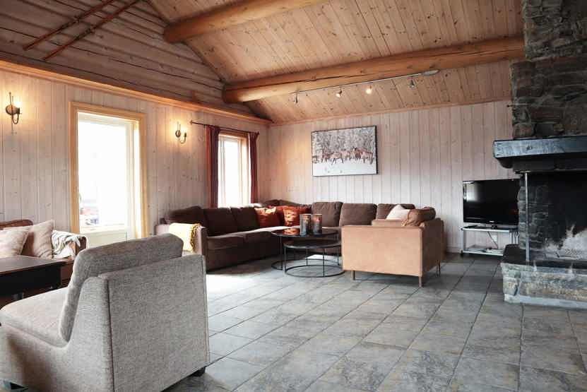 Hytte, 17 sengepladser, 240 m², alrum med køkkenafdeling, TV, pejs, 6 soveværelser, 3 bruser, 3 WC, badekar, 1 sauna. Vaskerum med vaskemaskine og tørretumbler.