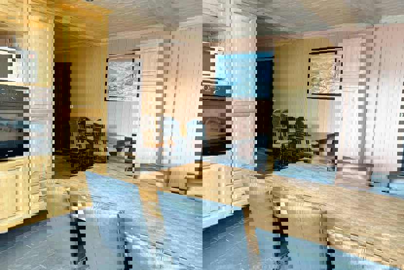 Hytte, 22+2 sengepladser, 280 m², alrum med køkkenafdeling, TV, pejs, 7 soveværelser, 6 brusere, 7 WC, 1 sauna. Tørrerum.