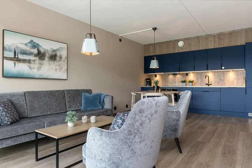 Totten Lodge 4303, moderne lejligheder med ski in/ski out beliggenhed i Hemsedal Skisenter. Byggeår 2022. Det familievenlige område ved Totteskogen ligger i gåafstand med 950 m til Hemsedal Fjellandsby med restauranter, supermarked og skiudleje.