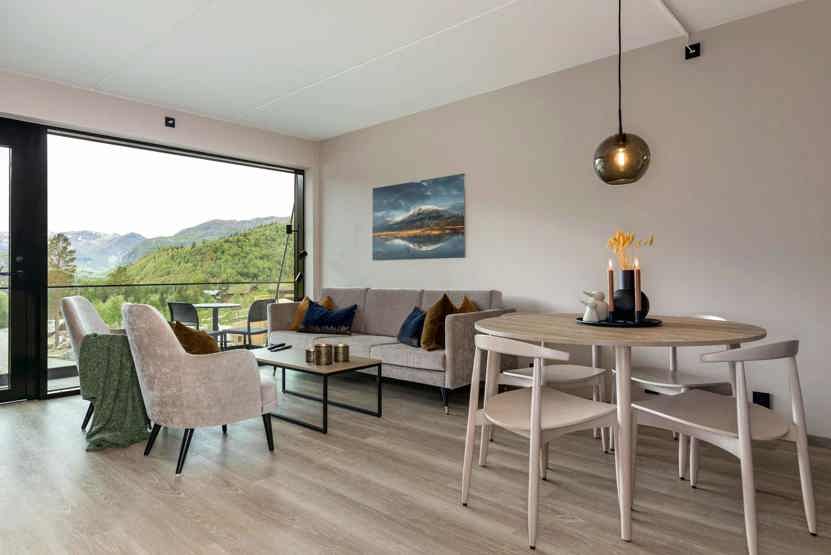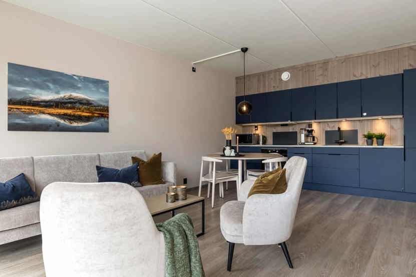 Lejlighed på 2 sal, 4+1 sengepladser, 55 m², opholdsstue, TV og køkkenafdeling, 2 soveværelser, 1 bruser, 1 WC. kombineret vaskemaskine/tørretumbler. Tørreskab, Skiopbevaring med skotørrer findes i bygning. Parkering mod gebyr (garage eller udendørs). Adgang til elbilopladere med type 2 stik.