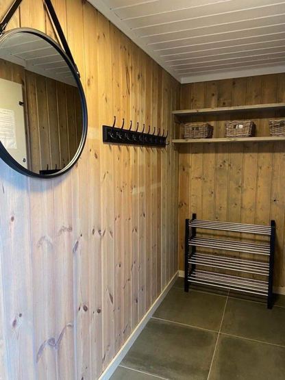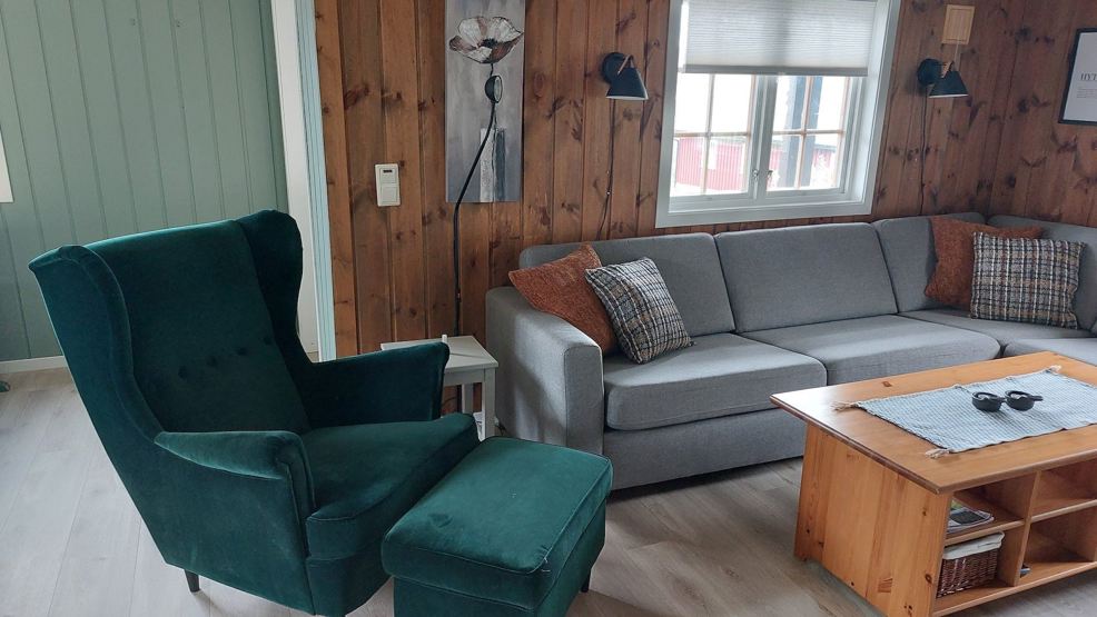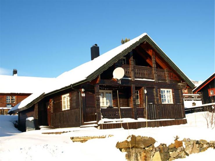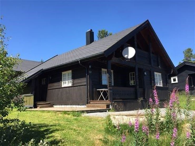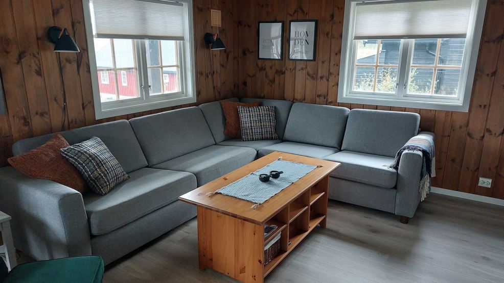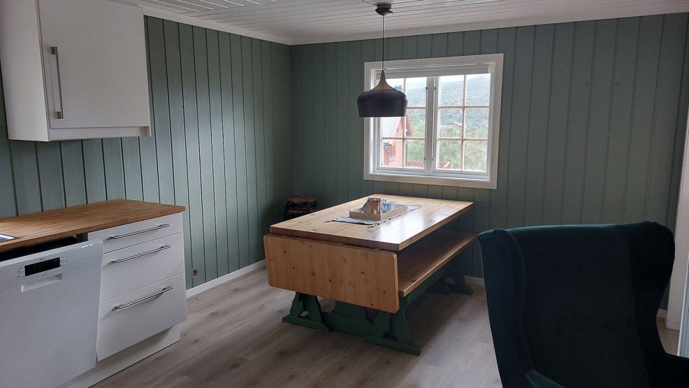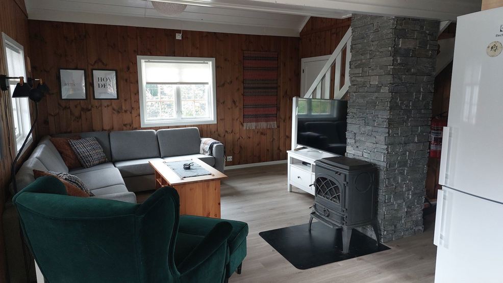Hovden Fjellpark 52 har åpen løsning mellom stue og kjøkken. Her kan du kose deg på en solrik terrasse eller foran peisen i stuen.