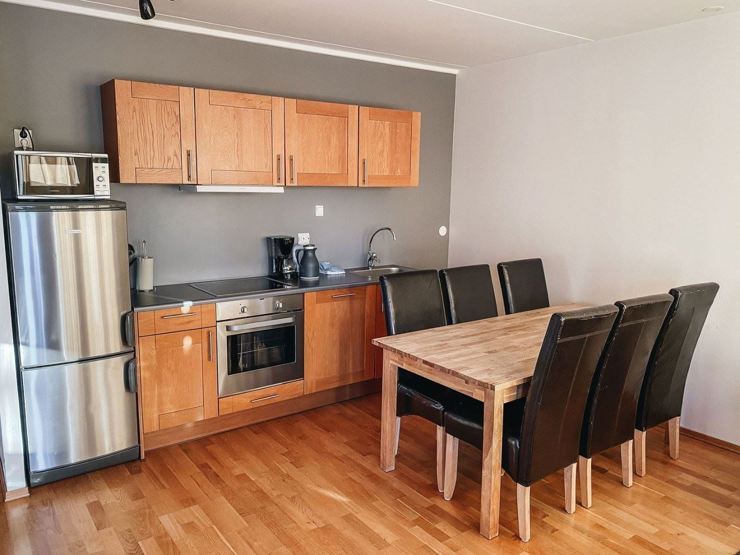 Romfasiliteter: Sofa, stort spisebord, fullt utstyrt kjøkken med oppvaskmaskin, kaffetrakter, vannkoker, mikro, klesskap, tørkeskap, flislagt bad med dusj, eget toalett, TV & wi-fi.