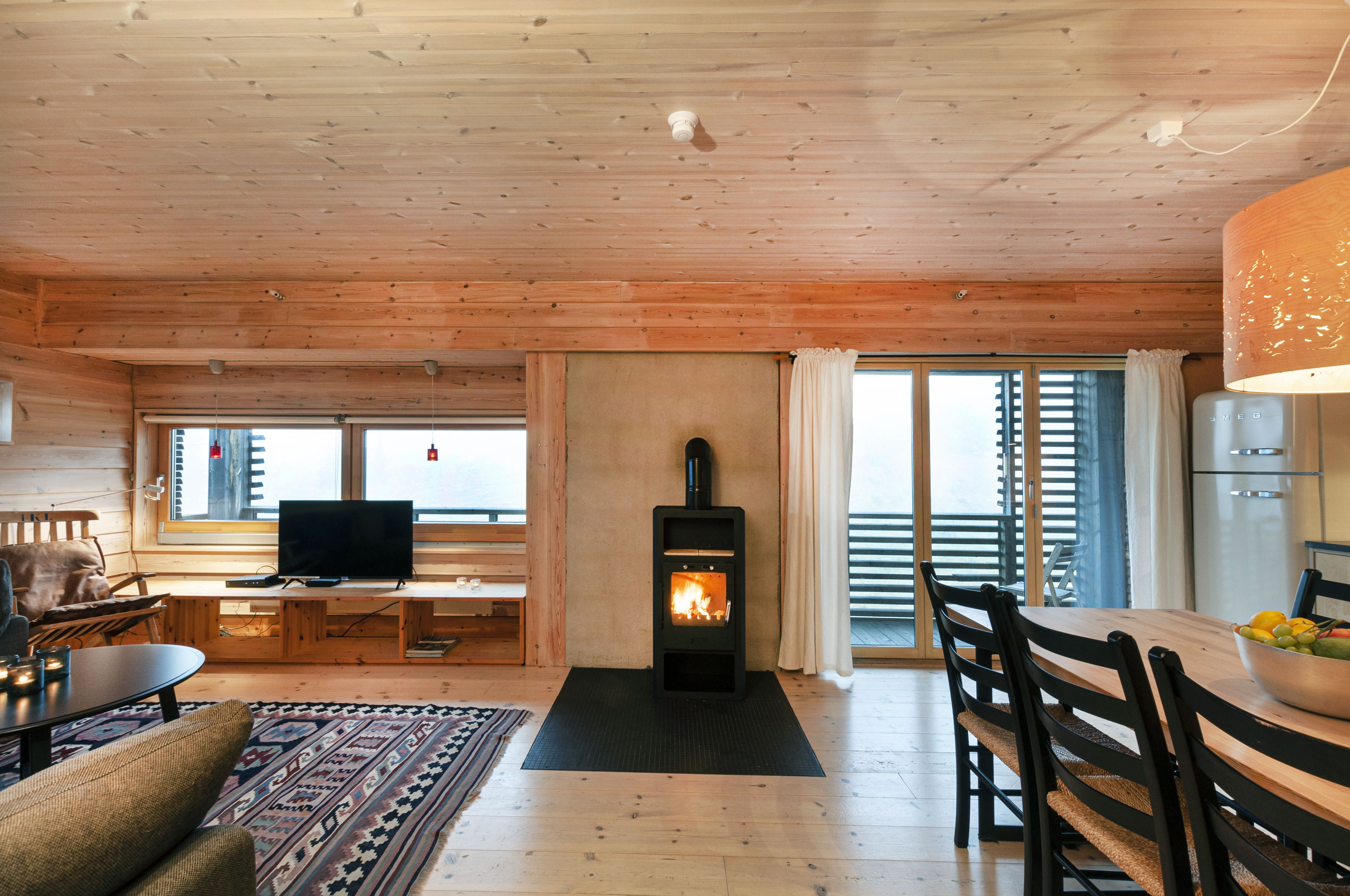 Lejlighed 121 - 7 personer. 65 kvm. 2 soveværelser. Åben planløsning med fuldt udstyret køkkenafdeling. Opholdsstue med sofagruppe, brændeovn, TV og spiseplads til 7 personer. 1 bruser, 1 WC, vaskemaskine. Balkon. Lejligheden er privatejet, interiør kan variere.