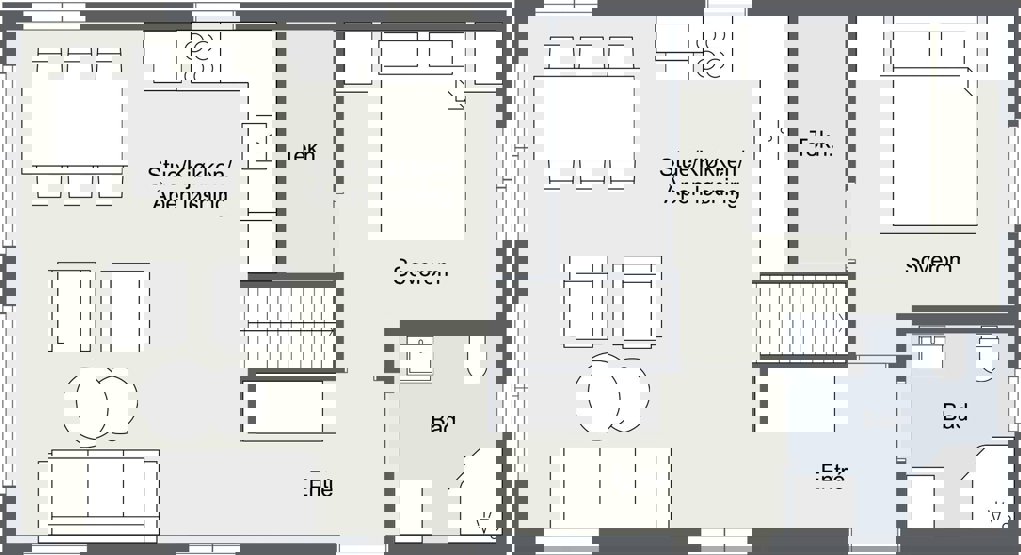 Soveværelse 1 + 2: 1 dobbeltseng (180cm x 200cm). Soveværelse 3: 1 enkelteng (90cm x 200 cm)